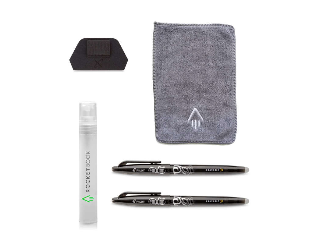 Tento praktický balíček příslušenství k Rocketbooku obsahuje vše, co potřebujete k zapisování poznámek v nejlepší formě. Sada obsahuje dvě pera FriXion s krytkami (černá), jeden mikrovláknový hadřík, jednu rozprašovací láhev a jedno nalepovací držadlo na pero. Možná jste některé své potřeby ztratili během zvlášť intenzivního zápisu poznámek. Nebo si prostě chcete doplnit zásoby, abyste byli připraveni na příští. Tak či onak, tato sada zajišťuje, že budete vždy připraveni na jakoukoliv operaci zapisování, která vás potká.